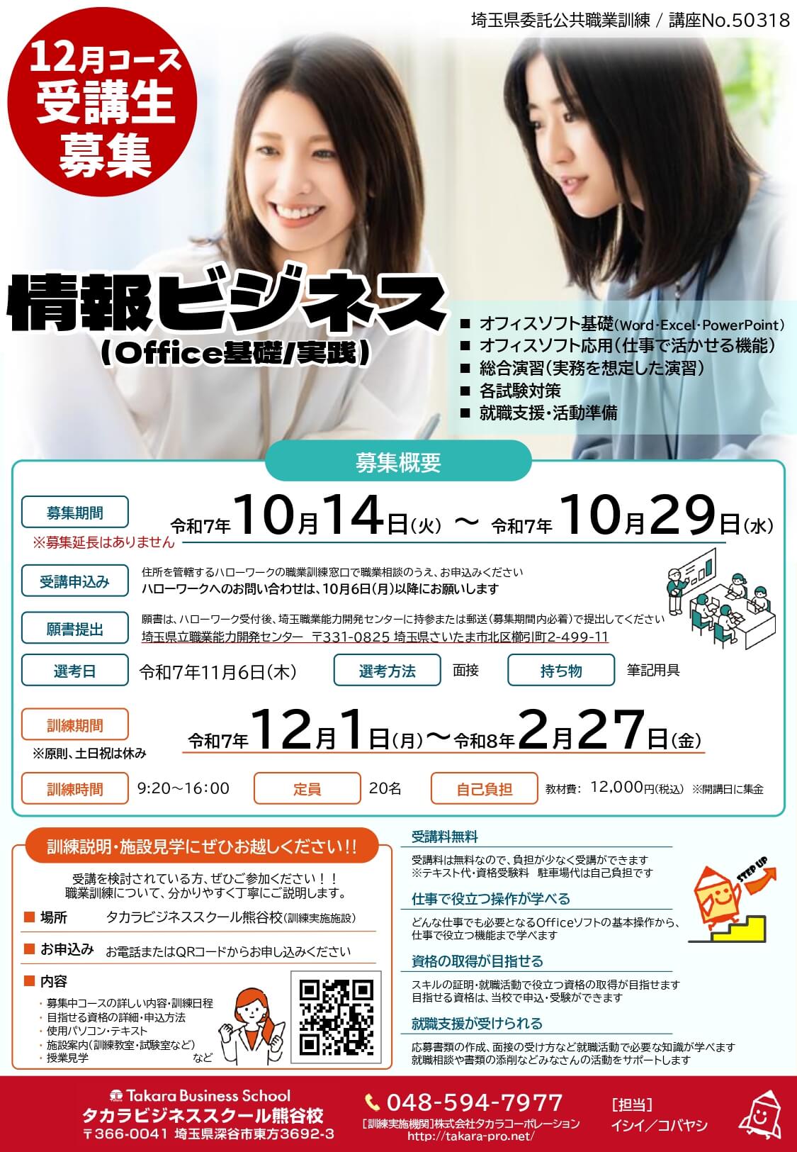 埼玉県委託公共職業訓練の12月開講コース「情報ビジネス(Office基礎/実践)」の募集が10/14(火)から開始します!