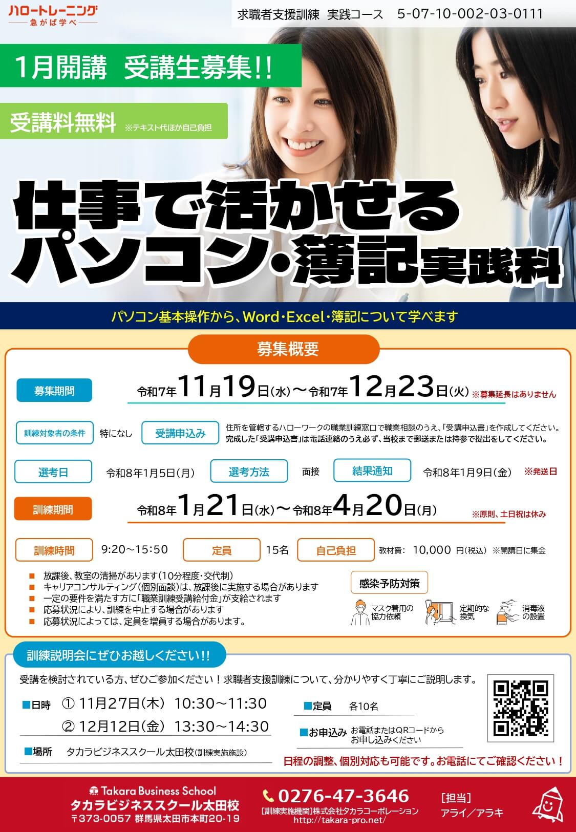 群馬県求職者支援訓練の1月開講コース「仕事で活かせるパソコン・簿記実践科」の募集をしております!