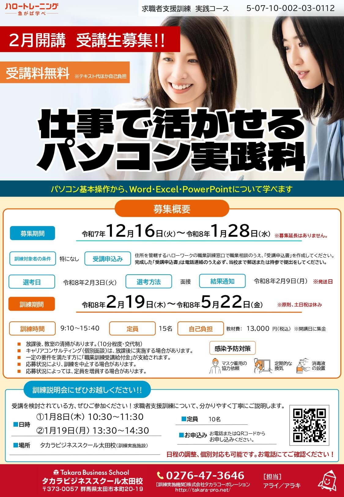 群馬県求職者支援訓練の2月開講コース「仕事で活かせるパソコン実践科」の募集をしております!