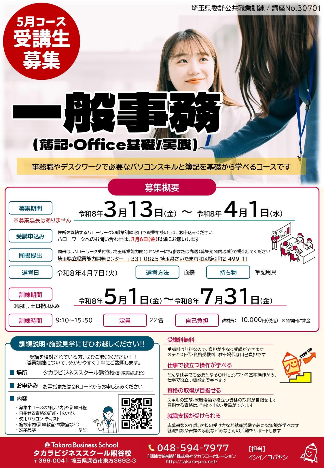 埼玉県委託公共職業訓練の5月開講コース「一般事務(簿記・Office基礎/実践)」の募集が3/12(金)から開始します!