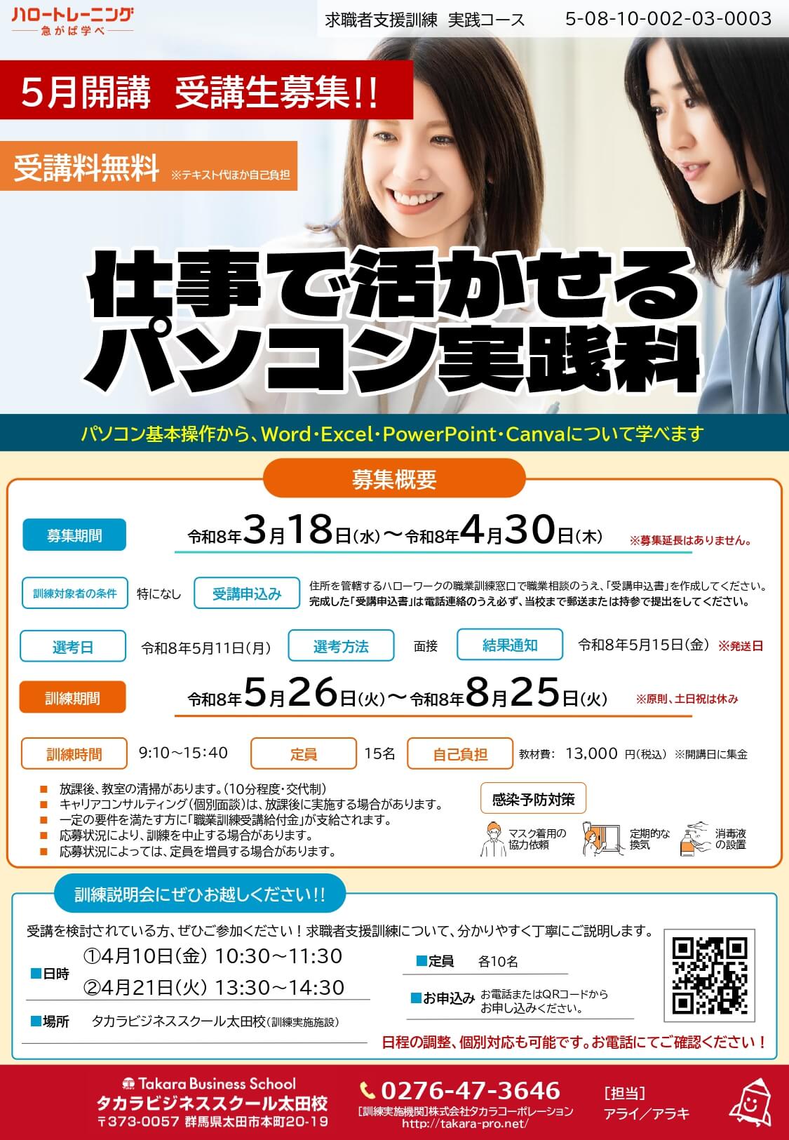 群馬県求職者支援訓練の5月開講コース「仕事で活かせるパソコン実践科」の募集をしております!